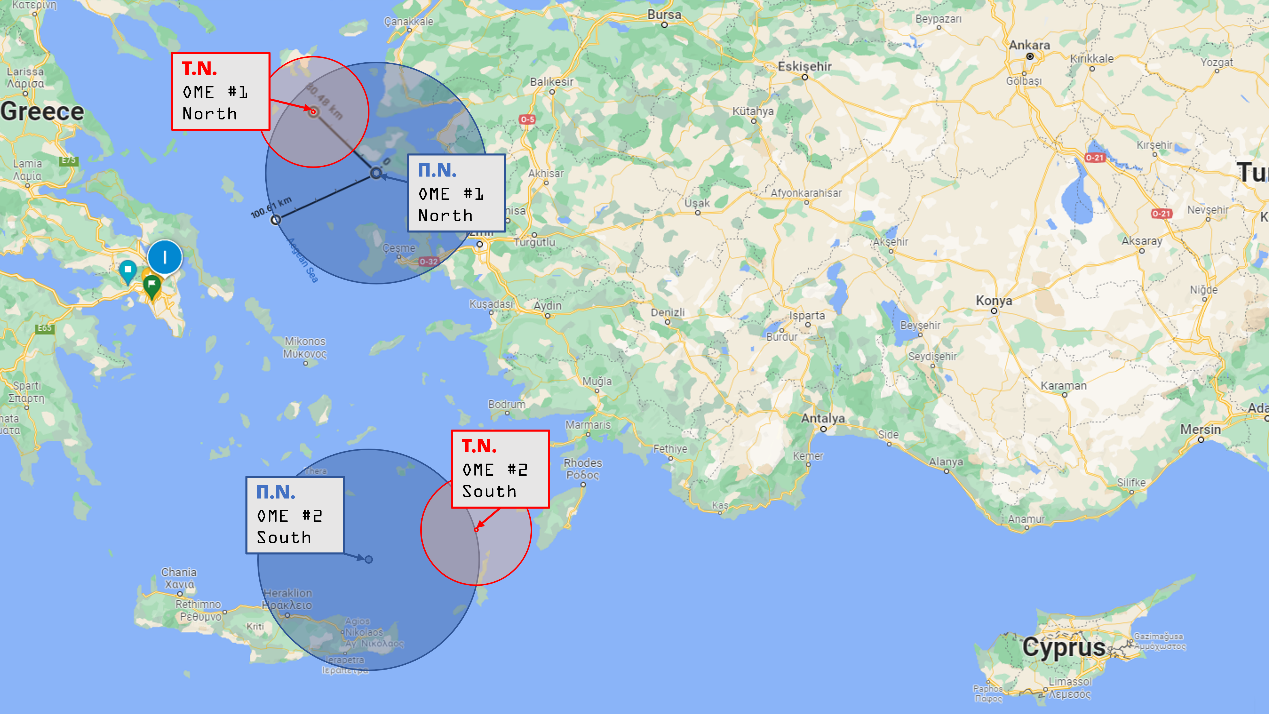 Οι θέσεις των στόλων, απόγευμα 25ης Ιουλίου 2029. Οι κύκλοι γύρω από τις τέσσερις Ομάδες Μάχης Επιφανείας (ΟΜΕ) συμβολίζουν την αντιαεροπορική ομπρέλα ακτίνας 100χλμ για τον Aster 30 και 50χλμ για τους ESSM.