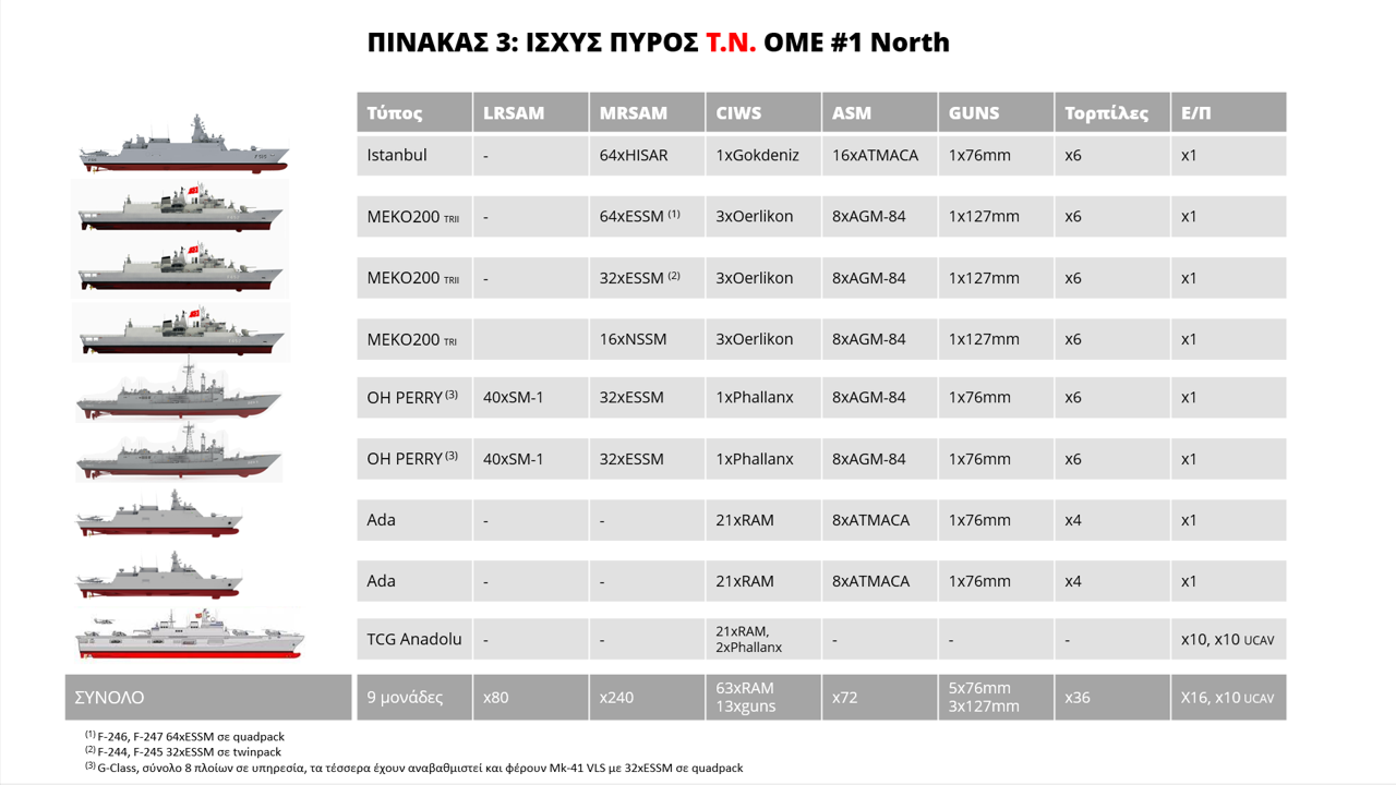 Οι 80 πύραυλοι SM-1 των O.H. Perry δεν τον προβληματίζουν ιδιαίτερα. Είναι παρωχημένης τεχνολογίας, και η καταύγαση στόχου που απαιτούν από τα ραντάρ των πλοίων είναι αργή και προβληματική σε συνθήκες κορεσμού. Πιθανότατα δεν θα τους χρησιμοποιήσει καν ο εχθρός. Ωστόσο, απέναντί του βρίσκεται και ένα εντυπωσιακό απόθεμα 240 πιο σύγχρονων αντιαεροπορικών πυραύλων μέσης εμβέλειας. Αυτό σημαίνει πως ο Τούρκος διοικητής έχει την πολυτέλεια να εξαπολύσει 2 και 3 πυραύλους εναντίον κάθε ελληνικού αντιπλοϊκού πυραύλου που θα βληθεί εναντίον του. Επίσης, η τελευταία ζώνη αεράμυνας των Τούρκων συμπληρώνεται από πυραύλους RAM και ένα σύνολο 13 CIWS πυροβόλων που θα βάλλουν όλα μαζί κατά των επερχόμενων ελληνικών πυραύλων.