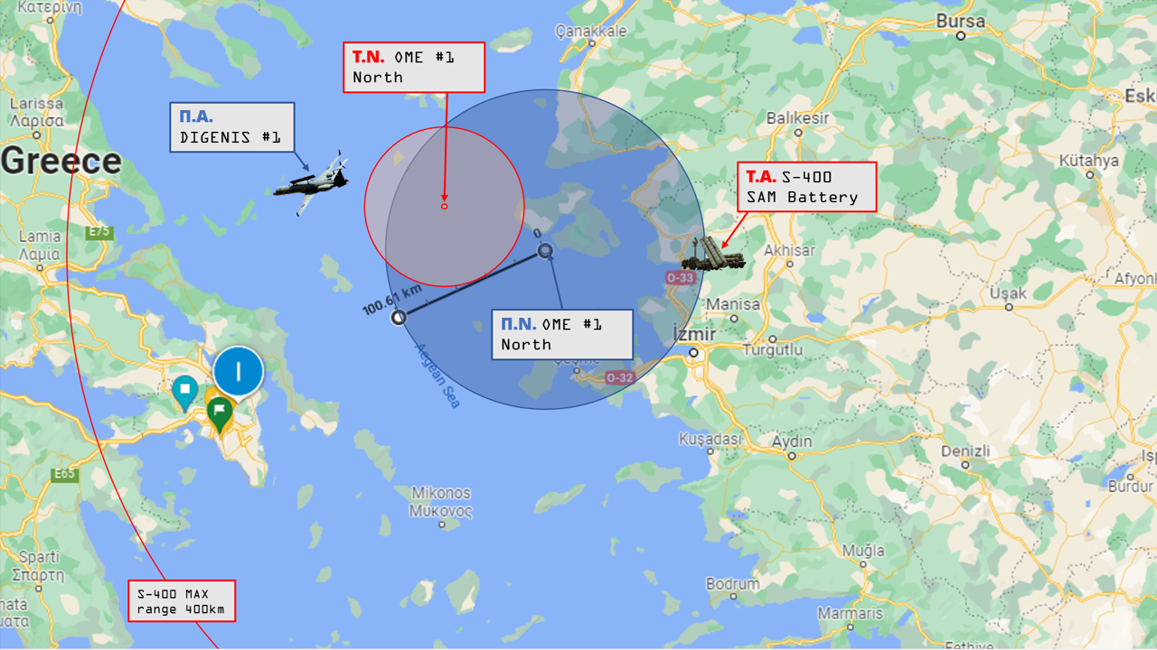 Ώρα 06:28: Με ταχύτητα σχεδόν 3,5 Mach οι δύο τουρκικοί αντιαεροπορικοί πύραυλοι βρίσκονται σε λιγότερο από μισό λεπτό ήδη πάνω από τη Λέσβο και συνεχίζουν βορειοδυτικά προς τη θέση του Διγενή #1. Μόνο αυτός μπορεί να είναι ο στόχος. Τα μαχητικά της Π.Α. που βρίσκονται στην περιοχή μειώνουν διαρκώς το ύψος πτήσης τους όσο πλησιάζουν τους S-400, ώστε εκμεταλλευόμενα την καμπυλότητα της Γης να παραμένουν στο τυφλό σημείο της τουρκικής πυροβολαρχίας, κάτω από τον ορίζοντα (radar shadow). Ο Διγενής #1 όμως είναι υποχρεωμένος να πετά σε μεγαλύτερο ύψος ώστε να κατοπτεύει τις χαμηλές πτήσεις των Τούρκων και να παρέχει εικόνα στο στόλο. Είναι δηλαδή εκτεθειμένος στο θανάσιμο αυτό αντιαεροπορικό στοιχείο της Τουρκίας.