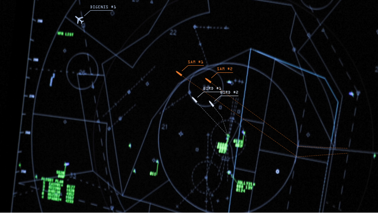 Στο Κέντρο Επιχειρήσεων, ο πλοίαρχος και ο Αξιωματικός Επιχειρήσεων στέκονται όρθιοι πίσω από την καρέκλα του επικελευστή στη θέση Α/Α όπλων. Και οι τρεις παρακολουθούν με τα μάτια καρφωμένα στην κονσόλα την πορεία των τεσσάρων βλημάτων. Με γαλάζια εικονίδια και τα χαρακτηριστικά Bird #1 και Bird #2, οι δύο Aster του “Κίμων” μειώνουν συνεχώς την απόσταση από τους δύο κόκκινους SAMs.