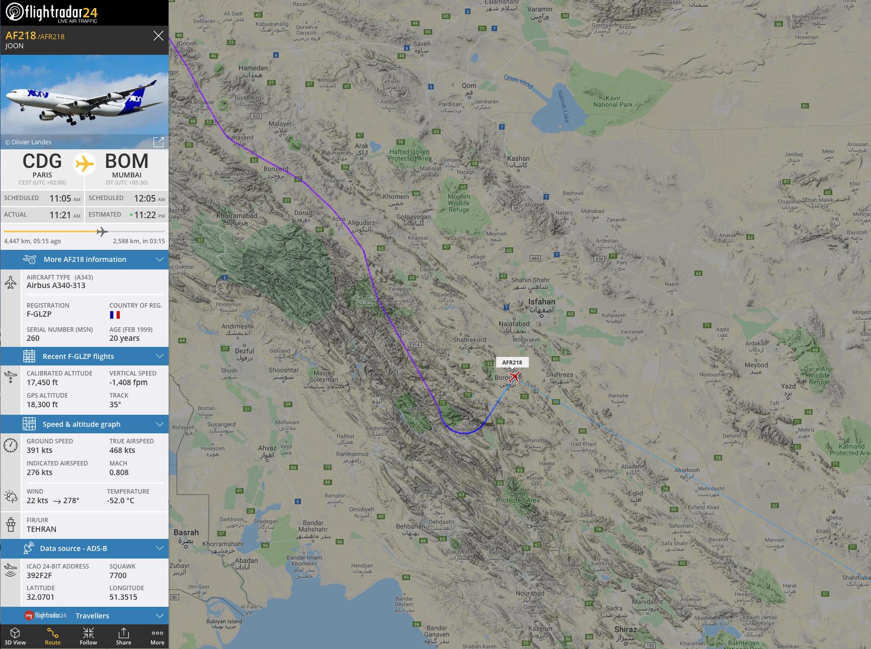 Με ασφάλεια προσγειώθηκε στο αεροδρόμιο του Ισπαχάν στο Ιράν ένα A340-313 της Air France που εκτελούσε την πτήση AF218 από το Παρίσι στο Μουμπάι της Ινδίας. Το αεροπλάνο είχε επισημανθεί να εκπέμπει σήμα ανάγκης (Squawking 7700) ενώ πετούσε πάνω από το Ιράν και σύμφωνα με στοιχεία του Flightradar24 κατερχόταν στην περιοχή του Ισπαχάν.