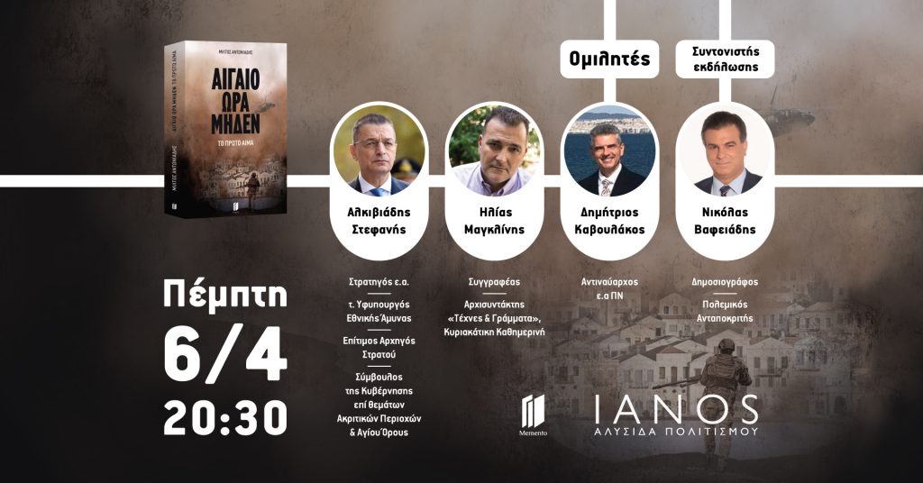Με χαρά ανακοινώνουμε την παρουσίαση του βιβλίου του «δικού μας» Μίλτου Αντωνιάδη «Αιγαίο Ώρα Μηδέν: Το Πρώτο Αίμα» στον χώρο εκδηλώσεων του βιβλιοπωλείου Ιανός στην Αθήνα, την Πέμπτη 6 Απριλίου στις 20:30.