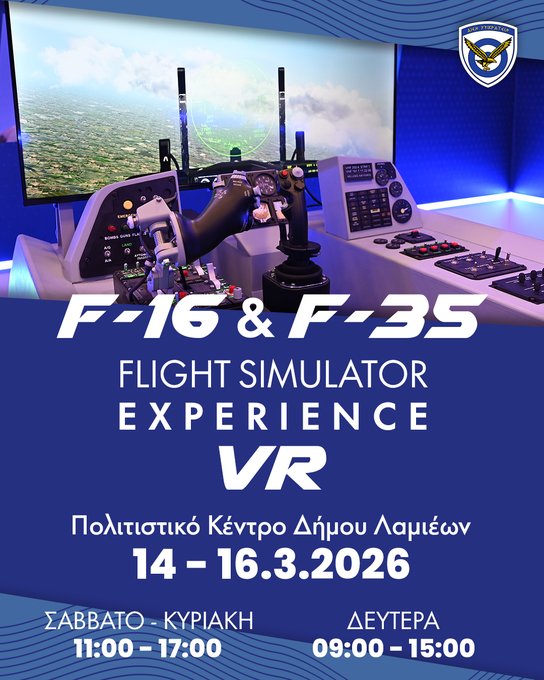 Νιώσε την εμπειρία της πτήσης μέσα από προσομοιωτές F-16, F-35 & συσκευές εικονικής πραγματικότητας (VR). Στη Λαμία 14 – 16 Μαρτίου 2026, στο Πολιτιστικό Κέντρο Δήμου Λαμιέων. Σάββατο & Κυριακή 11:00-17:00 και Δευτέρα 09:00-15:00.