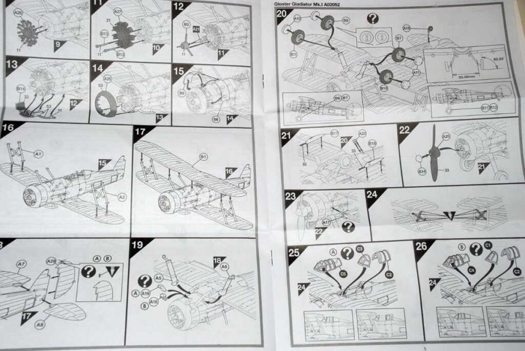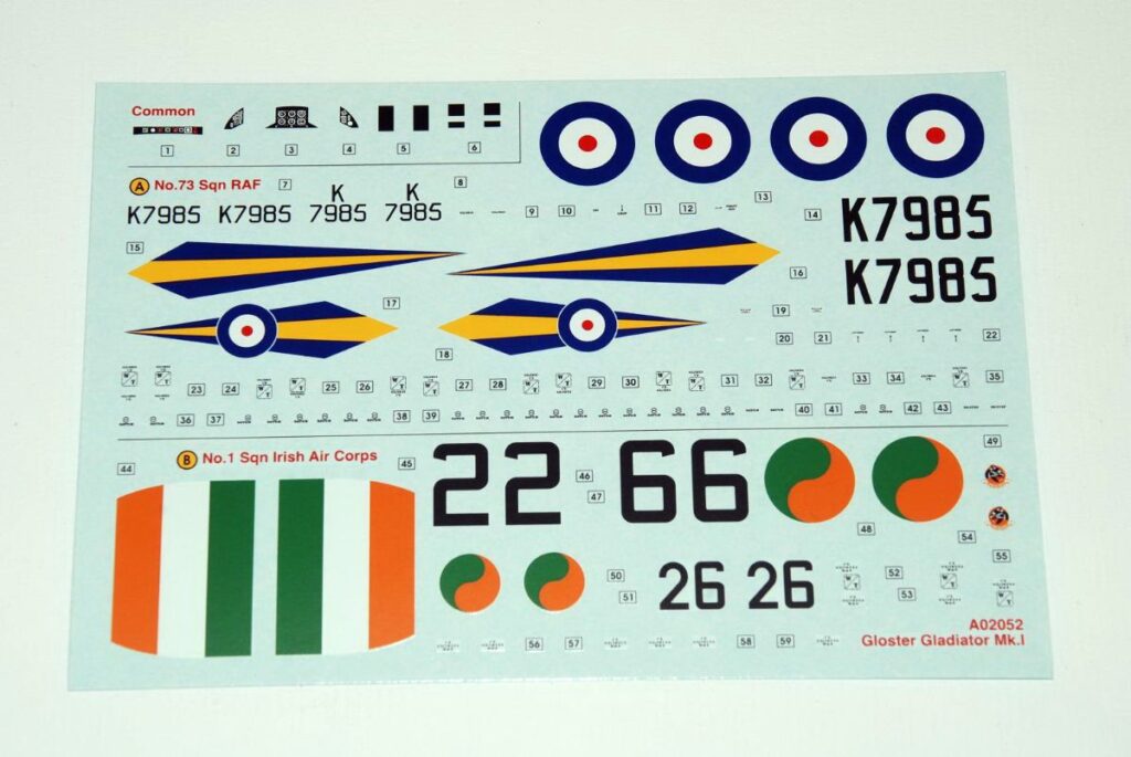 Η καρτέλα σημάτων περιέχει δύο σετ για ένα ολομεταλλικό Gladiator της Νο.73 Μοίρας της RAF (Hendon 1937) και για ένα καμουφλαρισμένο (πράσινες και καφέ άνω επιφάνειες) της ιρλανδικής αεροπορίας το 1940. Για πρώτη φορά σε καρτέλα τέτοιου κιτ βλέπουμε να υπάρχουν άφθονα προειδοποιητικά. Όλα τα σήματα είναι καλοτυπωμένα, με σωστά χρώματα και λεπτό ματ φίλμ (ποιότητα Cartograf). Τέλος οι οδηγίες είναι αρκούντως αναλυτικές και επεξηγηματικές με 26 στάδια, έγρωμες πολλαπλές όψεις (profiles) με αναφορές σε χρώματα Humbrol και με αριθμημένες όλες τις χαλκομανίες για εύκολη τοποθέτηση, καθώς και οδηγίες για την τοποθέτηση των συρματόσχοινων. Βάση δεν περιέχεται αλλά μπορεί να αγοραστεί χωριστά από ειδικό κιτ της Airfix με σετ βάσεων σε μαύρο ή διαφανές πλαστικό (στο original σχήμα των αρχικών πεταλοειδών βάσεων που πάντοτε υπήρχαν στα παλαιότερα κιτ της εταιρίας).