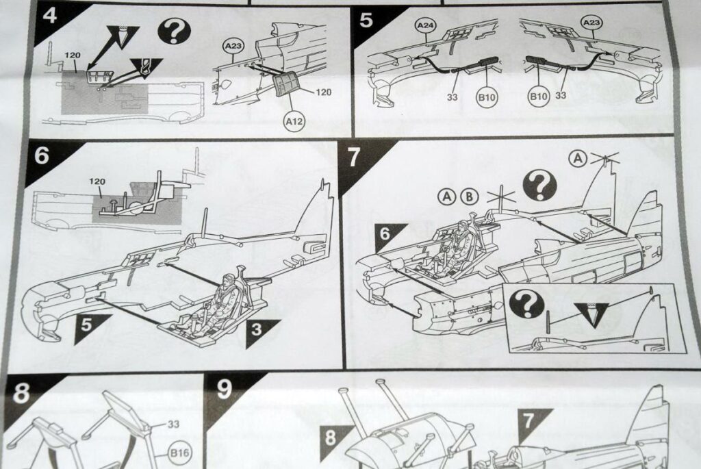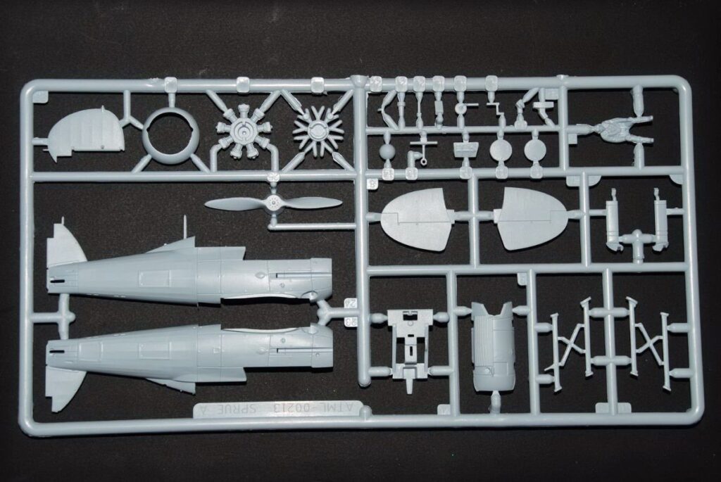 Όλα τα κομμάτια είναι τέλεια καλουπαρισμένα, διαθέτοντας εξαιρετικά χαραγμένες γραμμώσεις, αλλά και υπερυψωμένες ανάγλυφες ραβδώσεις σε αναπαράσταση των υφασμάτινων επικαλύψεων στο πίσω μέρος της ατράκτου και στις πτέρυγες. Οι πτέρυγες δίνονται σε δύο κομμάτια (άνω και κάτω) απλοποιώντας την κατασκευή χωρίς να θυσιάζεται η λεπτομέρεια. Η άτρακτος είναι λεπτομερέστατη, με χωριστό rudder (πηδάλιο διεύθυνσης) και τέσσερα χωριστά, λεπτότατα καλύμματα του κινητήρα. Ο τελευταίος αποτελείται από μια σειρά 9 κυλίνδρων, τον πολλαπλό σωλήνα εξαγωγής καυσαερίων στο πίσω μέρος και μια σειρά άλλων εξαρτημάτων, που με ένα σωστό βάψιμο θα δείξει τέλεια. Η έλικα διαθέτει σωστά διαμορφωμένα λεπτά φύλλα, αν και παρέχεται μόνο η δίφυλλη του Mk.I. Eπίσης χωριστά προσφέρονται τα δύο πλευρικά πολυβόλα της ατράκτου, καθώς και τα άλλα δύο κάτω από τις πτέρυγες. Το κόκπιτ διαθέτει πάτωμα με ανάγλυφα ποδωστήρια, κάθισμα, ρεαλιστική φιγούρα πιλότου, πίνακα με χαλκομανίες για τα όργανα, χειριστήριο, πυξίδα, καθώς και ανάγλυφες λεπτομέρειες στα πλευρικά εσωτερικά τοιχώματα της ατράκτου. Η πτυσσόμενη θυρίδα επιβίβασης του πιλότου δίνεται κλειστή αλλά με ένα προσεκτικό χάραγμα με τον κόφτη μπορεί να αποκοπεί και να κολληθεί στην ανοικτή (κατεβασμένη) θέση και μάλιστα με έτοιμη ανάγλυφη λεπτομέρεια. Περιέχονται δύο στυλ καλύπτρας με διαφορετικού σχήματος αλεξίνεμο (early & late type), ενώ διαφορετικά κομμάτια δίνονται για κλειστή και διαφορετικά για ανοικτή καλύπτρα. Ατυχώς στο δικό μας κιτ υπήρχε ένα πολύ άσχημο (και αδύνατο να διορθωθεί) σημάδι (μικρή τρύπα με «σκασίματα» σαν να είχε δεχτεί σφαίρα…) σε μία από τις κλειστές, αλλά αν επιλέξετε ανοικτή καλύπτρα δεν αποτελεί πρόβλημα, αν δεχτούμε ότι το κακο-καλουπαρισμένο κομμάτι υπήρχε μόνο στο δικό μας δείγμα. Όλα τα διαφανή πάντως έχουν εξαιρετική διαύγεια, αν και θα προτιμούσαμε να έχουν μικρότερο πάχος και λεπτότερο/λιγότερο εξογκωμένο σκελετό.