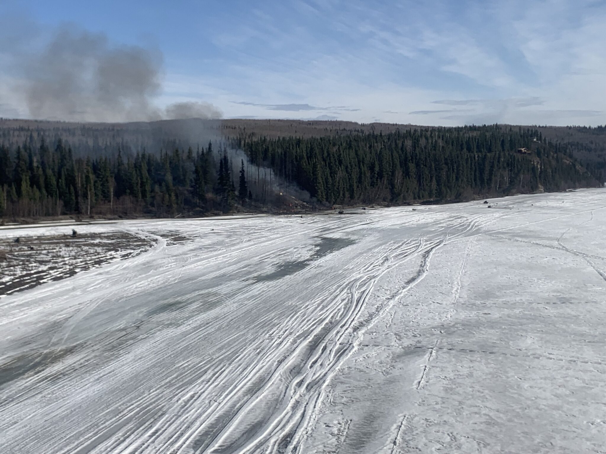 Φωτογραφία από τον τόπο της συντριβής που δημοσιοποίησαν οι αρχές εικονίζει βλάστηση στις φλόγες στην όχθη ποταμού καλυμμένου από πάγο, εν μέσω των οποίων βρίσκονται συντρίμμια του αεροσκάφους, που είναι εξαιρετικά δυσδιάκριτα.