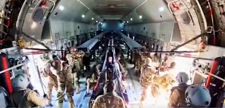 Βίντεο, που αναρτήθηκε από το Γενικό Επιτελείο Εθνικής Άμυνας (ΓΕΕΘΑ) στο Διαδίκτυο, δείχνει Έλληνες και Γερμανούς αλεξιπτωτιστές να πραγματοποιούν εκπαιδευτικό άλμα στην Ελλάδα από μεταγωγικό A400M Atlas της Luftwaffe.