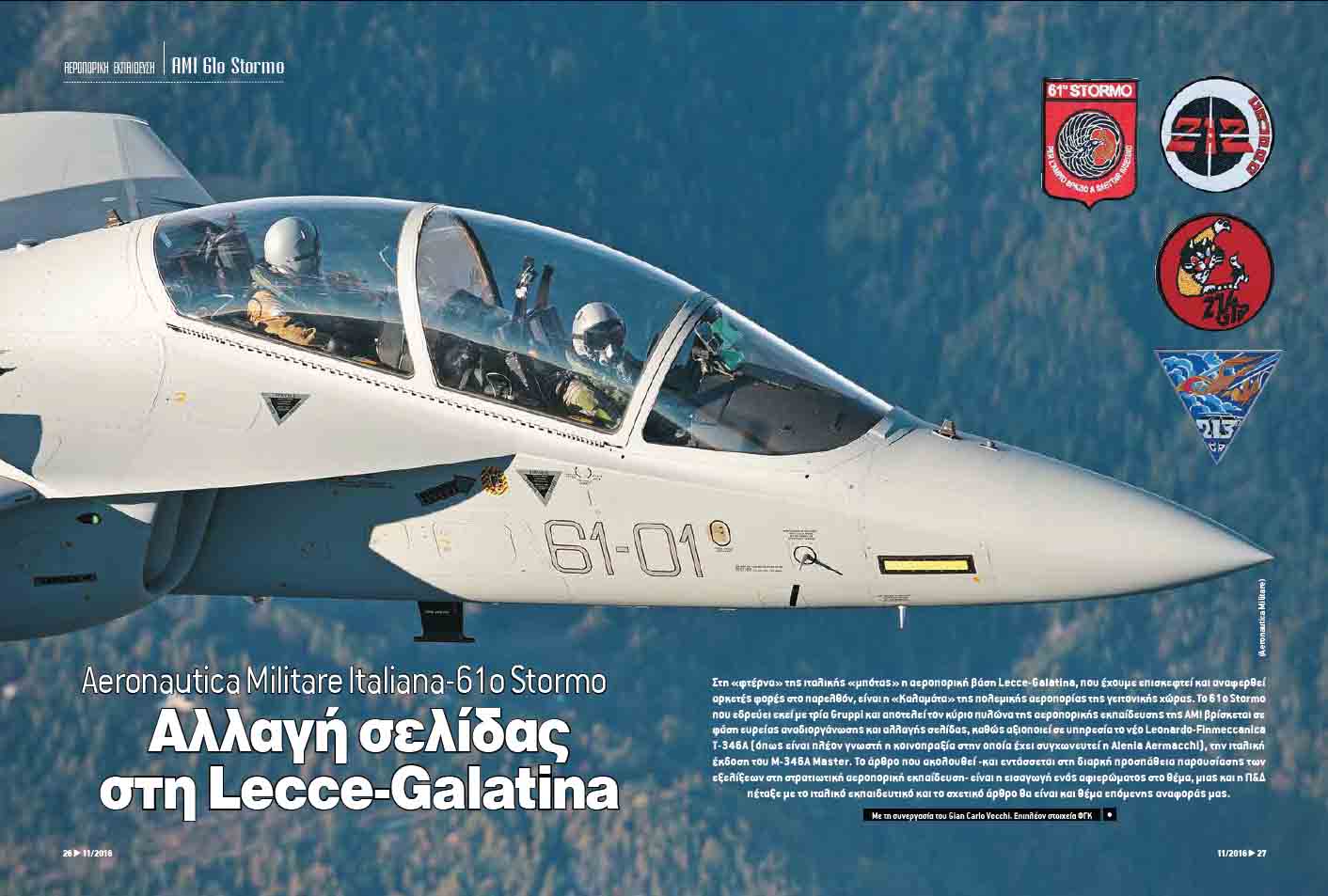 Στην «φτέρνα» της ιταλικής «μπότας» η αεροπορική βάση Lecce Galatina, που έχουμε επισκεφτεί και αναφερθεί αρκετές φορές στο παρελθόν, είναι η «Καλαμάτα» για την πολεμική αεροπορία της γειτονικής χώρας. Το 61ο Stormo που εδρεύει εκεί με τρία Gruppi και αποτελεί τον κύριο πυλώνα της αεροπορικής εκπαίδευσης της ΑΜΙ βρίσκεται σε φάση ευρείας αναδιοργάνωσης και αλλαγής σελίδας καθώς αξιοποιεί σε υπηρεσία το νέο Leonardo-Finmeccanica Τ-346A (όπως είναι πλέον γνωστή η κοινοπραξία στην οποία έχει συγχωνευτεί η Alenia Aermacchi ), την ιταλική έκδοση του M-346A Master. Το άρθρο που ακολουθεί –και εντάσσεται στην διαρκή προσπάθεια παρουσίασης των εξελίξεων στην στρατιωτική αεροπορική εκπαίδευση- είναι η εισαγωγή ενός αφιερώματος στο θέμα καθώς η Π&Δ πέταξε με το ιταλικό εκπαιδευτικό (όπως είχε κάνει το καλοκαίρι και ο αρχηγός Α/ΓΕΑ) και το σχετικό άρθρο θα είναι και το θέμα επόμενης αναφοράς μας.