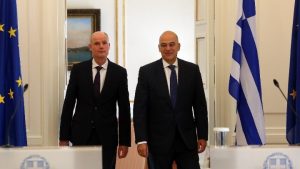Οι δύο άνδρες συζήτησαν ακόμη για την ευρωπαϊκή προοπτική των Δυτικών Βαλκανίων, μετά το πρόσφατο ταξίδι του κ. Δένδια στη Βόρεια Μακεδονία και την Αλβανία.