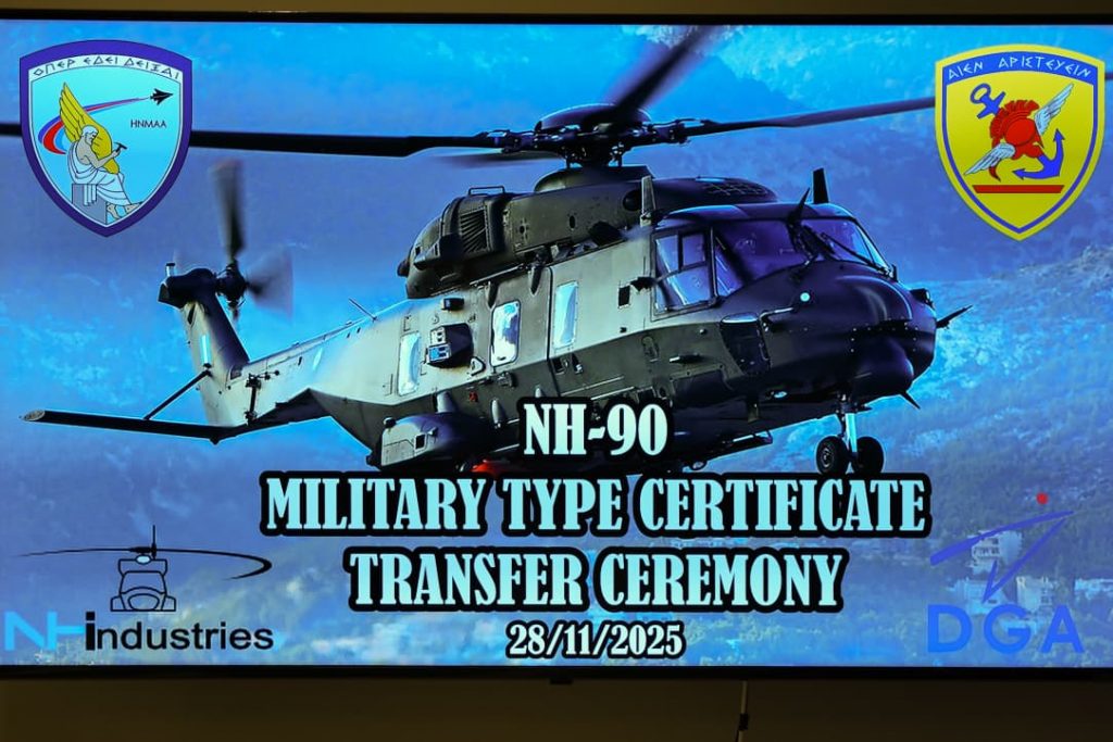 Την Παρασκευή 28 Νοεμβρίου 2025 έλαβε χώρα η τελετή απονομής Πιστοποιητικού Στρατιωτικού Τύπου (Military Type Certificate, MTC) στα ελικόπτερα ΝΗ–90, στις εγκαταστάσεις της Εθνικής Στρατιωτικής Αρχής Αξιοπλοΐας (ΕΣΑΑ), παρουσία του Αρχηγού ΓΕΕΘΑ Στρατηγού Δημητρίου Χούπη.