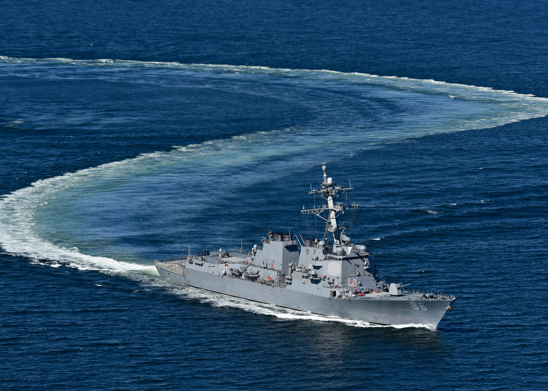 STRAIT OF GEORGIA (Sept. 13, 2016) The Arleigh-Burke-class guided-missile destroyer USS Shoup (DDG 86) conducts a high-speed turn during a torpedo evasion exercise. Shoup is underway conducting routine training exercise. (U.S. Navy photo by Mass Communication Specialist 2nd Class/Released)