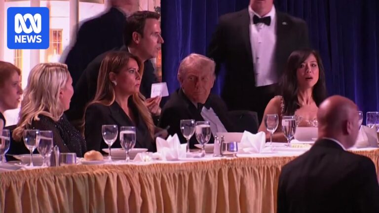 Σε βίντεο του Γαλλικού Πρακτορείου, φαίνεται ο πρόεδρος Τραμπ καθισμένος στο τιμητικό τραπέζι μαζί, μεταξύ άλλων, με τον αντιπρόεδρο Τζέι Ντι Βανς και την εκπρόσωπό του Καρολάιν Λέβιτ, καθώς και δημοσιογράφους, ενώ ακούγονται κρότοι που αρχικά δεν προκαλούν καμιά αντίδραση.