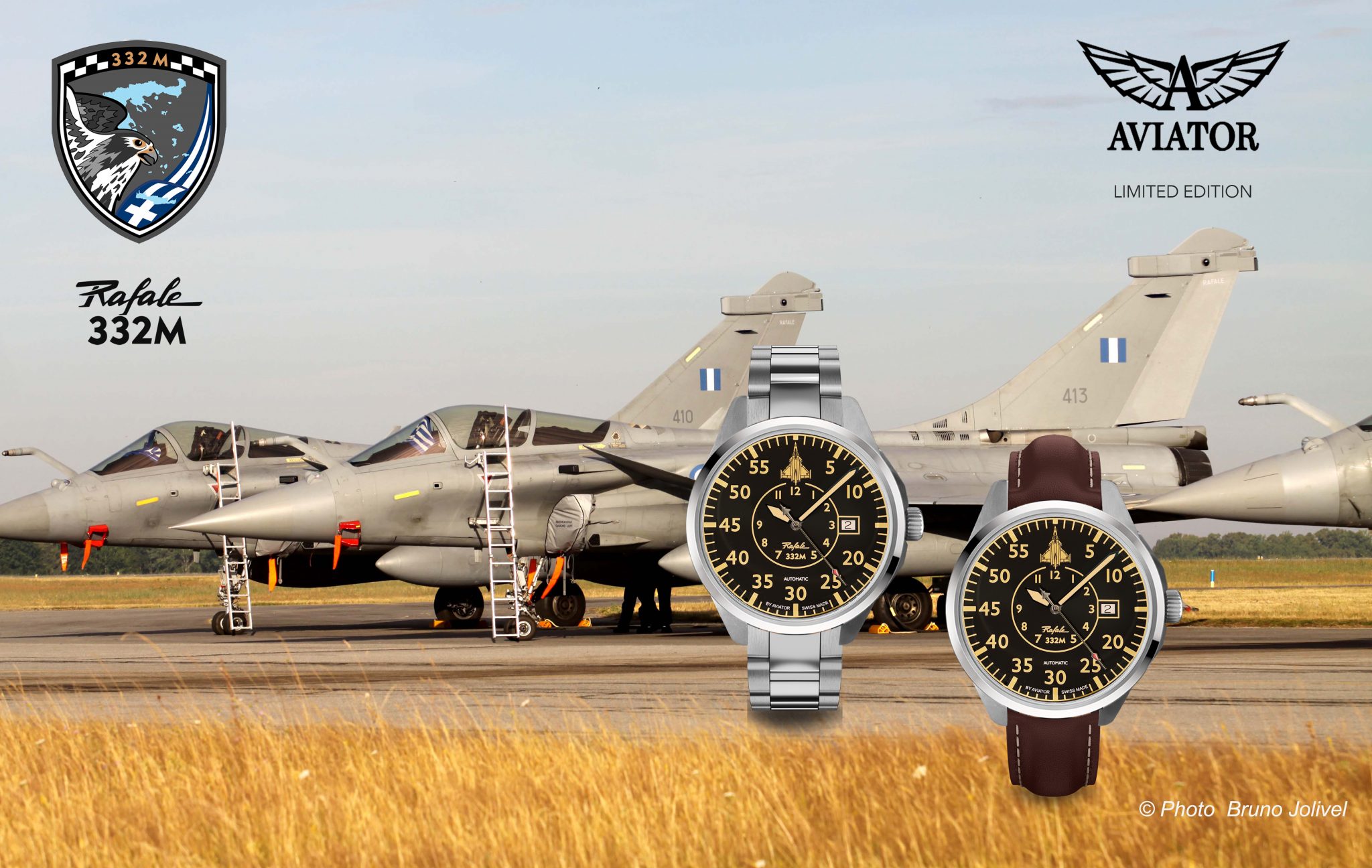 Με την ειδική συλλεκτική, περιορισμένη έκδοση της Aviator, αφιερωμένη στην 332 Μοίρα της Πολεμικής Αεροπορίας και το αεροσκάφος Rafale F3R, το ρολόι που φορούν οι Ιπτάμενοί της.