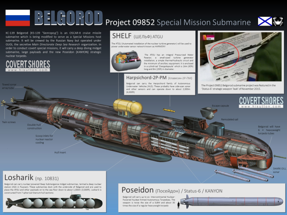 Το μεγάλο όπλο του Belgorod είναι η “διηπειρωτική” πυρηνοκίνητη τορπίλη Poseidon που σύμφωνα με ρωσικές πηγές θα φέρει κεφαλή ισχύος ως 100 μεγατόνους, αλλιώς γνωστή ως “Τορπίλη της Αποκάλυψης”. Οι αναφορες κάνουν λόγο για ένα πυρηνοκίνητο υποβρύχιο όπλο με ταχύτητα 56 κόμβων, ακτίνα 10.000 χιλιομέτρων και μέγιστο βάθος πλεύσης τα 1.000 μέτρα, εξοπλισμένο με θερμοπυρηνική κεφαλή.