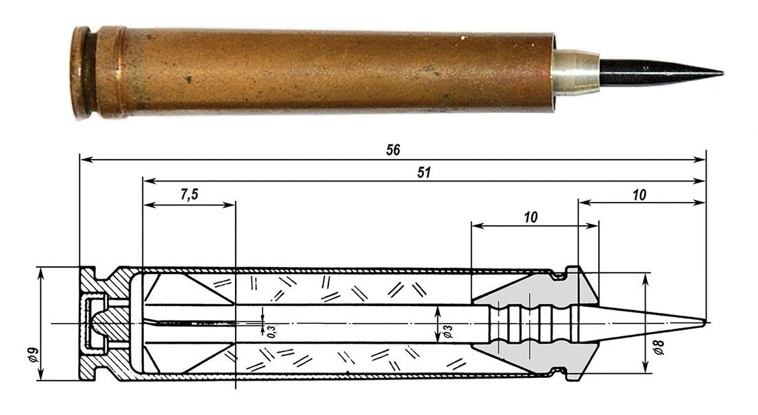 Αναπόφευκτα, το μικρό διαμέτρημα, αλλά και οι σχετικά ασθενείς θωρακίσεις των τότε αρμάτων, συνηγορούσαν υπέρ απλών βλημάτων κινητικής ενεργείας, από συμπαγές μέταλλο. Κάπως σαν μία μεγάλη βολίδα τυφεκίου, αλλά σαφώς σκληρότερη, με χάλυβα αντί μόλυβδο ως κύριο συστατικό. H διάτρηση, επιτυγχανόταν με τον γνωστό τρόπο της εισχωρήσεως, κάπως έτσι: