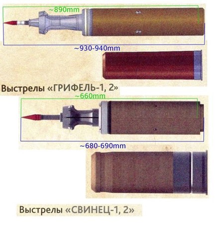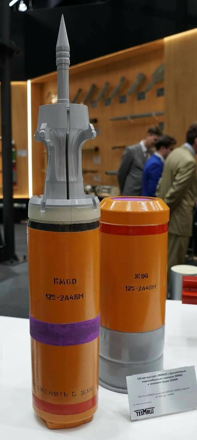 Αυτή ἠ διαφορά σε διαστάσεις του carousel, είναι και ὁ λόγος που ρωσικά πυρομαχικά συγκεκριμένης ονομασίας, π.χ “Svinets”, δίδονται με δύο κωδικούς αναγνωρίσεως, π.χ. 3ΒΜ46 και 3ΒΜ48, επειδή το βλήμα διατίθεται σε δύο εκδόσεις με διαφορετικό μήκος βέλους. Στην επόμενη φωτό έχουμε το “Svinets” (κάτω) κατ΄ αντιπαράσταση προς πυρομαχικό μάλλον προοριζόμενο για το Τ14 Armata, (επάνω) και το οποίο είναι ολομερούς φυσίγγης, ασχέτως aν ὁ κάλυκας είναι αναφλέξιμος, και όχι μεταλλικός. Άλλωστε, και ὁ κάλυκας των πυρομαχικών 120 χιλιοστών προδιαγραφών ΝΑΤΟ, για τα Leopard-2, M1 Abrams, Leclerc, Ariette, είναι αναφλέξιμος.