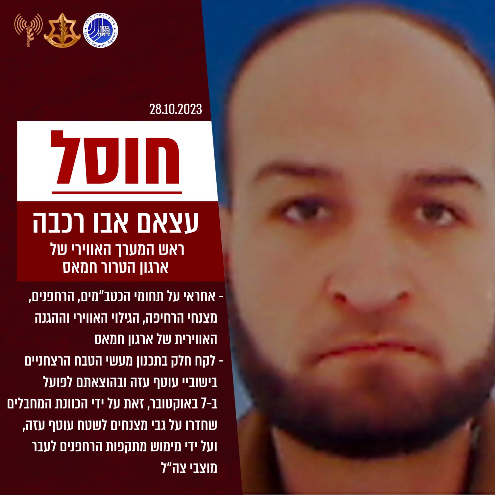 Ο Αμπού Ράφα ήταν υπεύθυνος για τη διαχείριση των UAV της οργάνωσης, των drones, της εναέριας αναγνωρισης και συλλογής πληροφοριών. Ταυτόχρονα ήταν ο διοικητης των ομάδων των παραπέντε της οργάνωσης. Υπενθυμίζουμε πως με παραπέντε έφτασαν οι τρομοκράτες στο φεστιβάλ ειρήνης κοντά στη Γάζα, σκοτώνοντας εκατοντάδες και παίρνοντας δεκάδες ομήρους.
