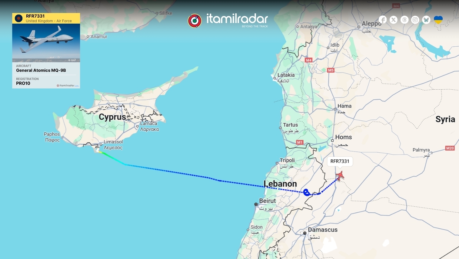 Όπως εντόπισε το Itamilradar, ένα βρετανικό μη επανδρωμένo, Reaper MQ9-B απογειώθηκε από την βρετανική βάση στο Ακρωτήρι, στην Κύπρο, και μετά μέσω Λιβάνου, πέρασε σε βάθος στον εναέριο χώρο της Συρίας. Όπως σημειώνεται, αυτό είναι ασυνήθιστο, καθώς μέχρι τώρα οι σχετικές αποστολές επισκόπησης παρέμεναν πάνω από διεθνή ύδατα.