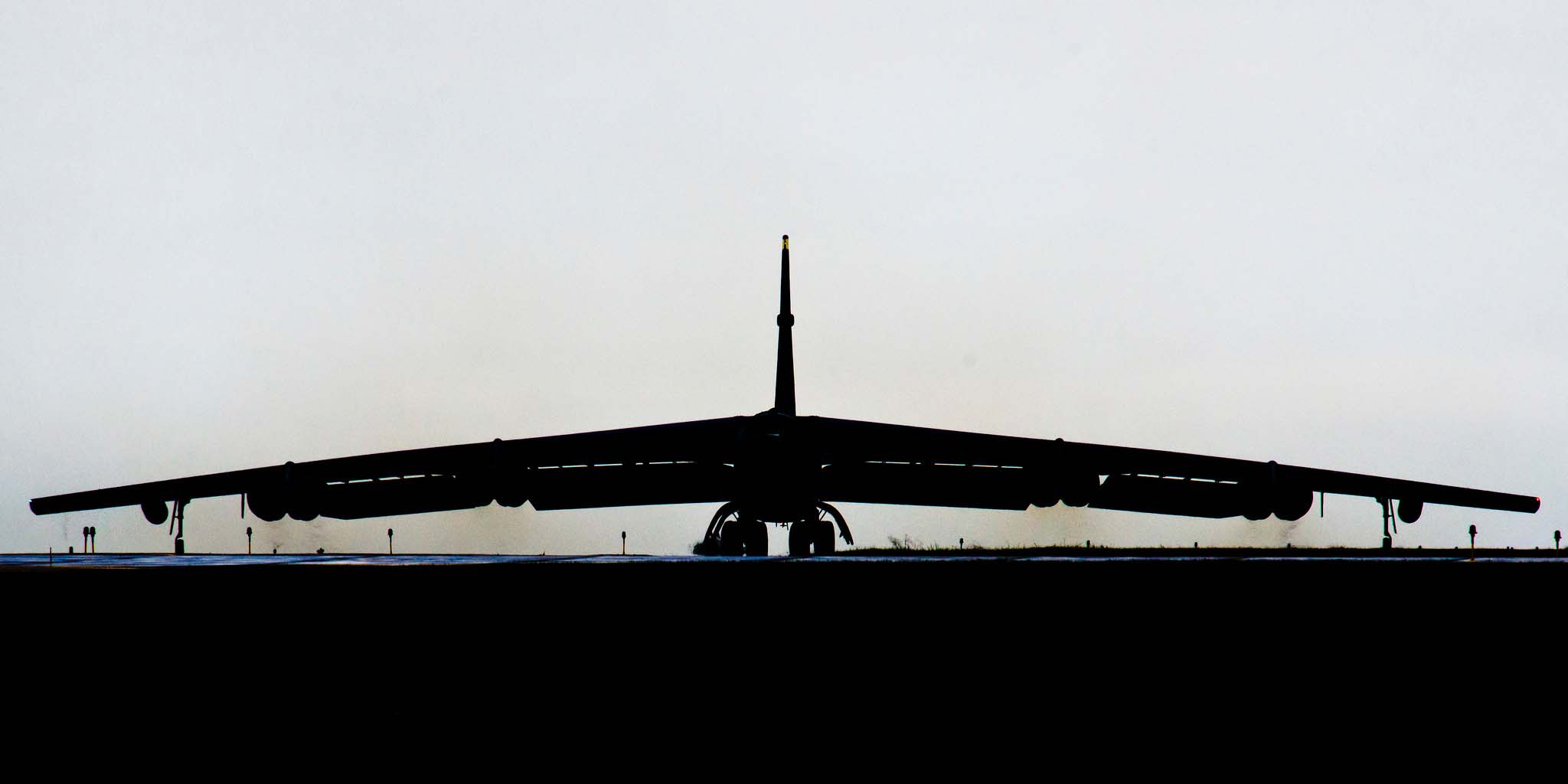 Σιλουέτα B-52H Stratofortress ενώ τροχοδρομεί στη Minot Air Force Base στην διάρκεια της άσκησης «Prairie Vigilance 16-1», (Φωτογραφία U.S. Air Force/Airman 1st Class J.T. Armstrong)
