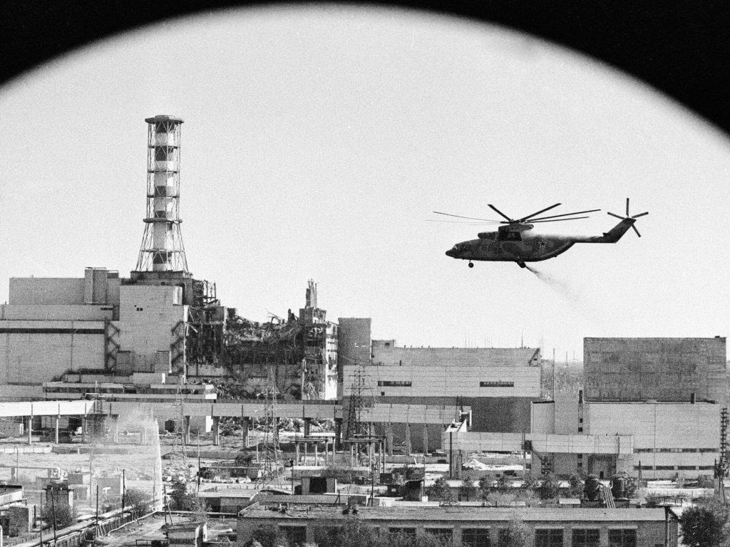 Απρίλιος 1986. Διάσημη φωτογραφία του Igor Kostin από τις προσπάθειες να «ταφεί» ο πυρήνας του αντιδραστήρα Νο4 στο Τσερνόμπιλ κάτω από αδρανή υλικά. Ελικόπτερα, με τα πληρώματά τους να εκτίθεται σε θανατηφόρα ραδιενέργεια έριξαν περισσότερους από 5.000 τόνους.