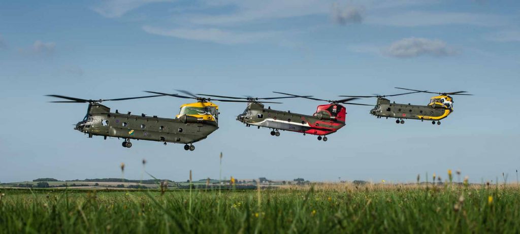 Special colors Chinook της RAF από τις Μοίρες 18,27 & 28 που γιορτάζουν τα 100 χρόνια τους. (φωτογραφία UK MoD).