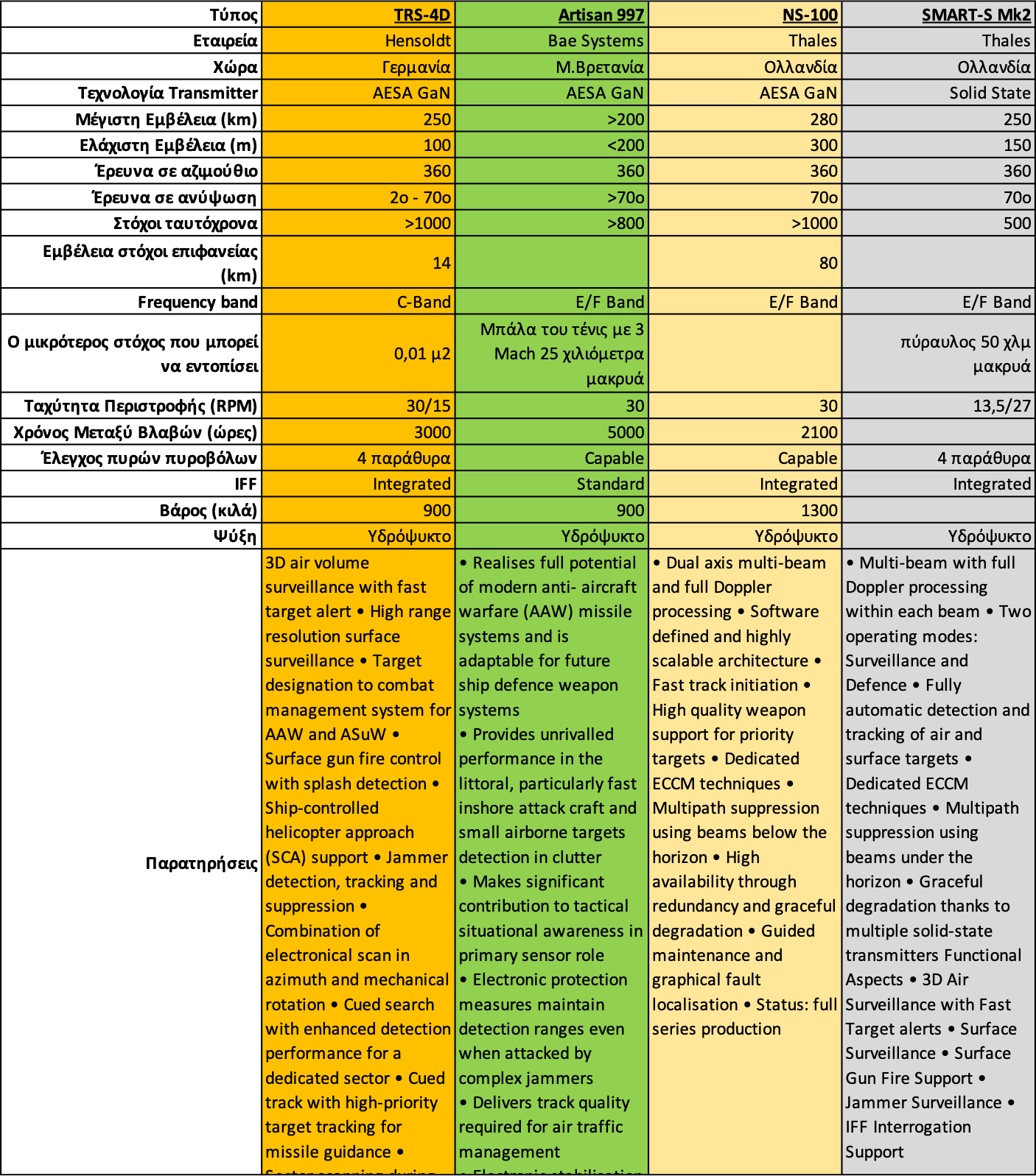 Αν οι φρεγάτες που θα ήθελε να αγοράσει το ΠΝ ήταν κυρίως ο αντιαεροπορικός αγώνας, τότε ίσως το TRS-4D να είναι οριακό. Σε ό,τι αφορά στον αγώνα AAW, απαιτείται ένα ισχυρότερο ραντάρ πολλαπλών ρόλων (MFR) με δυνατότητα υποστήριξης βολής SM-2MR και επαρκή αριθμό θυλάκων στον εκτοξευτή τόσο για βλήματα ESSM όσο και Standard. Από τη στιγμή όμως που το ΠΝ έκρινε πως πρωταρχικός στόχος είναι η αγορά φρεγατών πολλαπλού ρόλου, και πως η δυνατότητα AAW θα καλυφθεί από την Ενδιάμεση Λύση (που πρέπει να προσφέρουν οι ΗΠΑ), τότε ίσως είναι αρκετό και ένα ραντάρ χαμηλότερων επιδόσεων. Πόσο όμως “χαμηλές” επιδόσεις έχει το TRS-4D; Αυτό το οποίο θα κάνουμε είναι να το συγκρίνουμε, με τα εμπορικά διαθέσιμα στοιχεία του, με το εξαιρετικό Artisan 997. Κι όχι μόνο. Βλέπουμε λοιπόν πως το TRS-4D έχει χαρακτηριστικά όμοια ή ανώτερα των ανταγωνιστών του. Ας δούμε λιγάκι έναν συγκριτικό πίνακα.