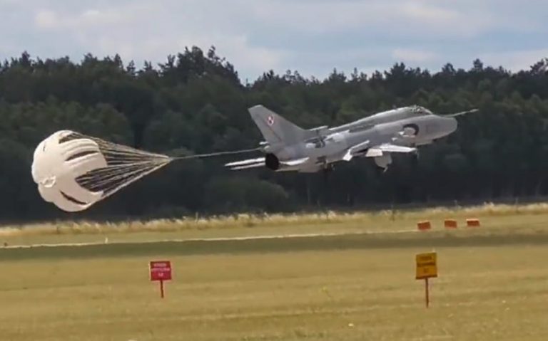 Η σωστή αντίδραση στην σωστή στιγμή ξεχωρίζει τους αεροπόρους από αυτούς που προσπαθούν να γίνουν. Πιάνοντας «μακρύς» στον διάδρομο κατά την προσγείωσή του στην αεροπορική βάση Świdwin, ο χειριστής ενός πολωνικού Su-22M4 (κωδ. ονομασία ΝΑΤΟ, ‘Fitter’) εφαρμόζει μια ειδική τεχνική για να μην υπερβεί το μήκος του: απελευθερώνει το αλεξιπροχώριο –ενώ το τζετ βρίσκεται ακόμη στον αέρα.