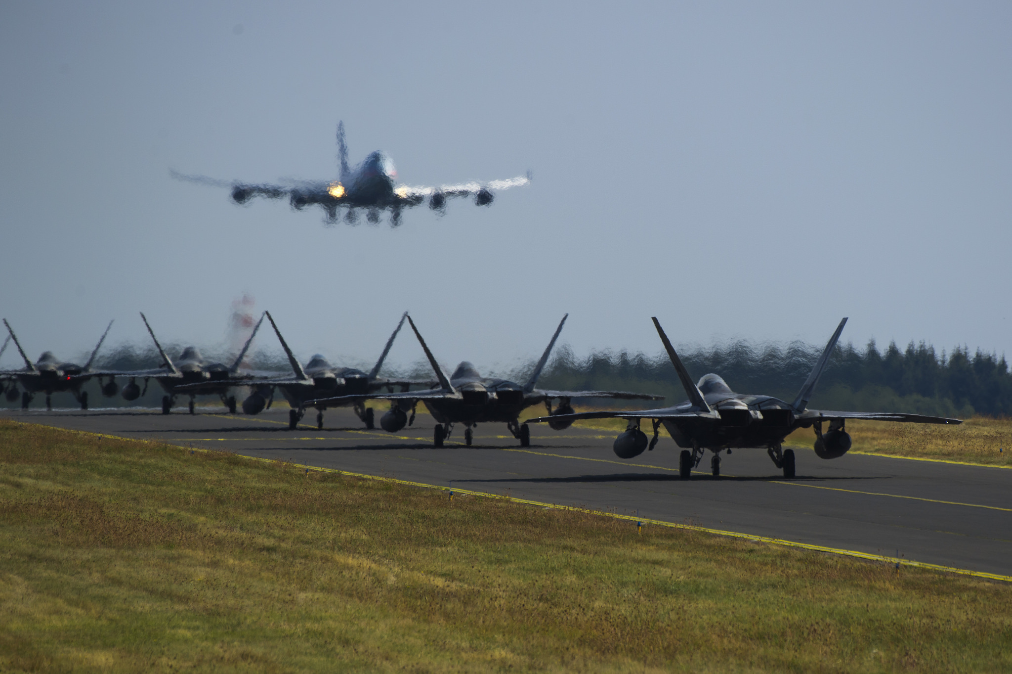 Τα F-22 της 95FS/325FW που είχαν έλθει στην Ευρώπη το Καλοκαίρι, εδώ τροχοδρομούν στη Spangdahlem Air Base.