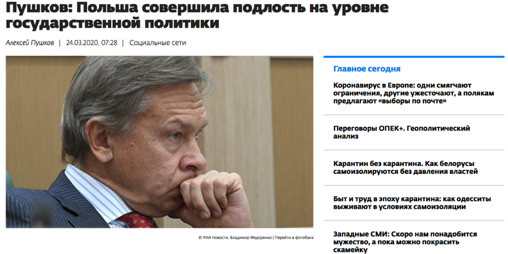 Στις 23 Μαρτίου, ο Ρώσος βουλευτής, Alexey Pushkov, βρήκε ευκαιρία να κατηγορήσει την Πολωνία λέγοντας ψευδώς πως η τελευταία αρνήθηκε να επιτρέψει σε ρωσικά αεροπλάνα που μετέφεραν ιατρική βοήθεια στην Ιταλία, να χρησιμοποιήσουν τον εναέριο χώρο της για το ταξίδι τους. Το tweet του Pushkov ήταν ψευδές και σβήστηκε μετά από λίγες ώρες αλλά το κακό είχε γίνει ήδη.
