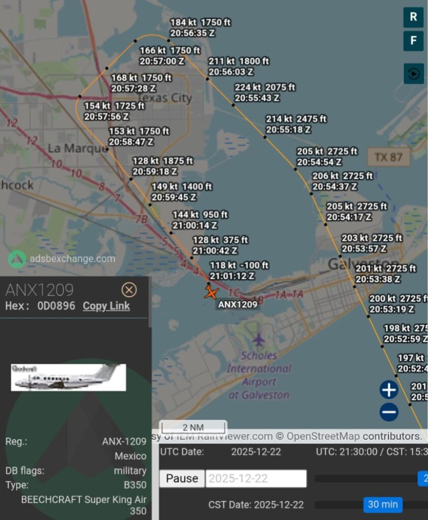 Σύμφωνα με την υπηρεσία Flight Radar, το αεροσκάφος είχε αναχωρήσει από τη Μέριδα, στη μεξικανική πολιτεία Γιουκατάν (νοτιοανατολικά) του Μεξικού, στις 13:46 (20:46 ώρα Ελλάδας) αλλά χάθηκε από τα ραντάρ στις 15:01 (23:01 ώρα Ελλάδας) πάνω από τον κόλπο της Γκάλβεστον, κοντά στο διεθνές αεροδρόμιο Σκόουλς.