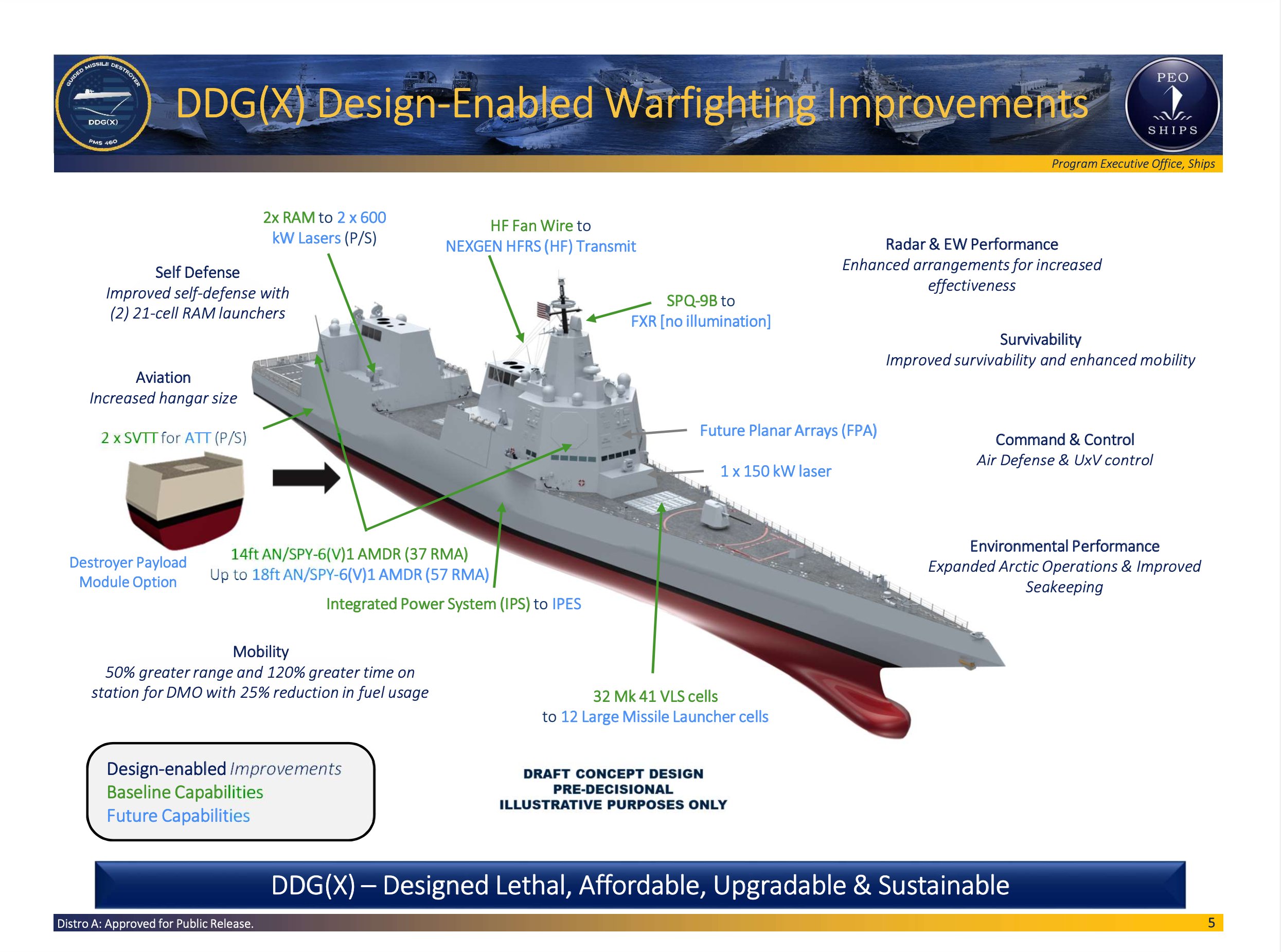 Τι θα είναι λοιπόν το νέο αμερικανικό αντιτορπιλικό DDG(X); Η προσπάθεια όπως φαίνεται είναι αυτή της «γέφυρας», δηλαδή ένα σκάφος νέας σχεδίασης, το οποίο θα έχει τη δυνατότητα να «φορέσει» άμεσα τα τρέχοντα οπλικά συστήματα του Αμερικανικού Ναυτικού, αλλά και να διαθέτει τις υποδομές, σε χώρους, σε παροχή ενέργειας, ως σχεδίαση, ως υπολογιστή ισχύ, κ.λπ. για να ενσωματώνει τις αναμενόμενες εξελίξεις σε όπλα και αισθητήρες.