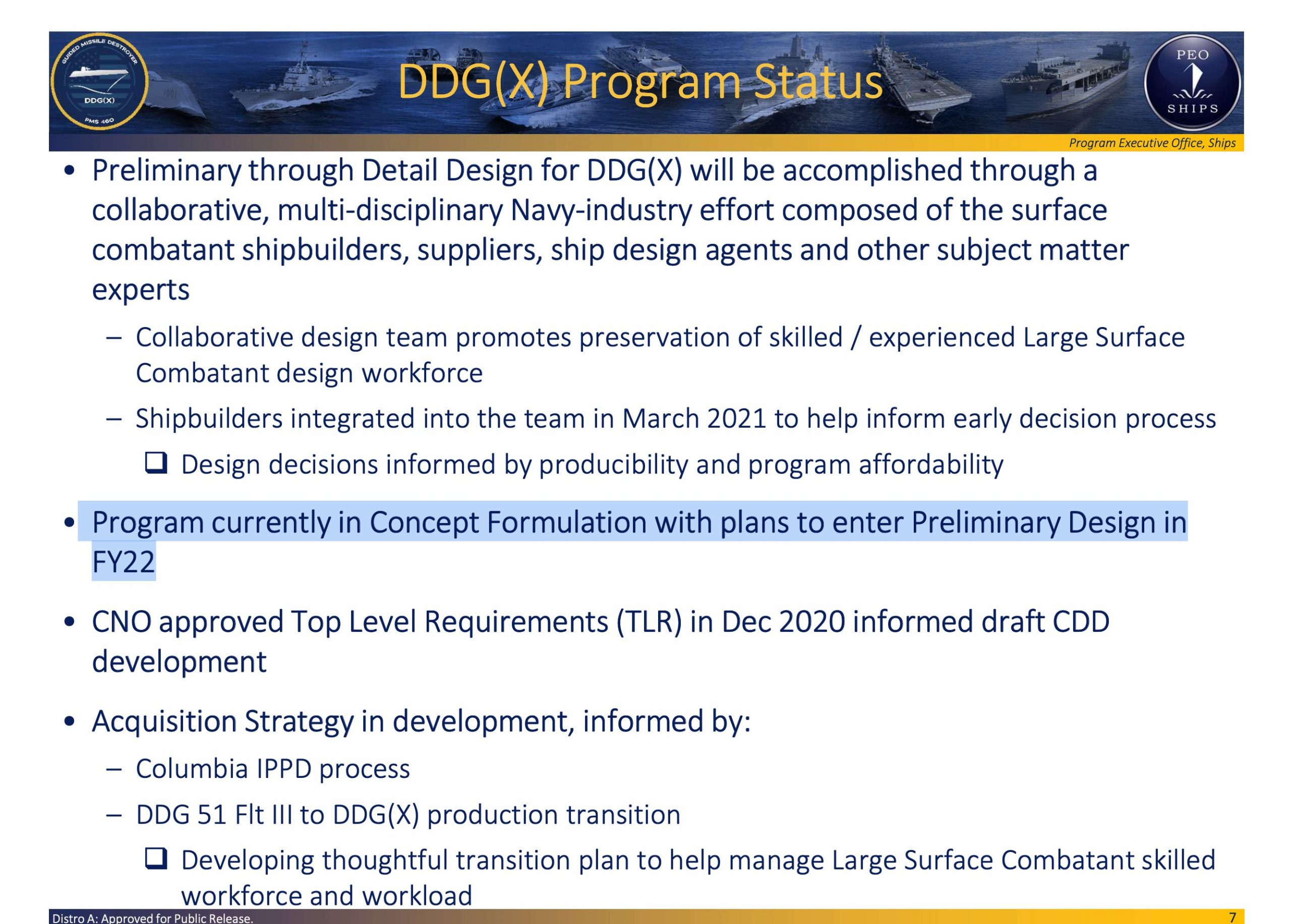 Το τελευταίο παρουσιάστηκε πρόσφατα ως πιο αναλυτικό σχέδιο και προδιαγραφή, αν και η έναρξη κατασκευής του απέχει ακόμη, και τοποθετείται το 2028 στην καλύτερη περίπτωση. Η παρουσίαση έγινε στο ετήσιο συμπόσιο της Ένωσης Σκαφών Επιφανείας (SNA), η οποία δρα ως φόρουμ επικοινωνίας εταιριών, ακαδημαϊκών, στελεχών του Ναυτικού, αποστράτων κ.ο.κ. που σχετίζονται με την υπηρεσία, κατασκευή, σχεδίαση, εξέλιξη σκαφών επιφανείας και της σχετικής φιλοσοφίας ναυτικής ισχύος (πρωτοβουλίες σαν και αυτή δυστυχώς λείπουν από την Ευρώπη και προφανώς την Ελλάδα).