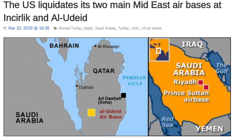 Σύμφωνα με όσα αναφέρει ο ισραηλινός ιστότοπος Debkafile, οι ΗΠΑ σκέφτονται να μεταφέρουν δυο στρατιωτικές βάσεις σε νέες τοποθεσίες. Η μια αφορά μεταφορά της US CENTCOM από το Κατάρ στη Σαουδική Αραβία και η δεύτερη, τη μεταφορά των στοιχείων της αεροπορικής βάσης του Incirlik από τη Τουρκία στην Ελλάδα και συγκεκριμένα στην 117ΠΜ στην Ανδραβίδα. ΠΡΟΣΟΧΗ: Η είδηση δεν επιβεβαιώνεται από αμερικανικές πηγές.