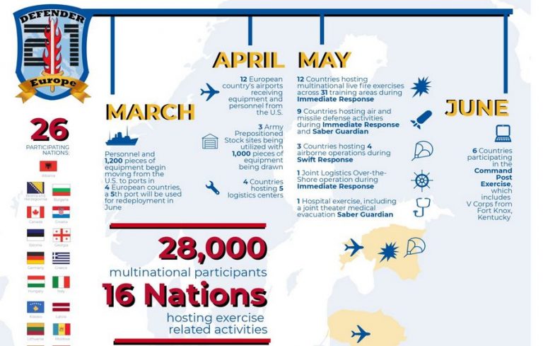 Η μεγάλη πολυεθνική άσκηση Defender-Europe 21, υπό την ηγεσία του αμερικανικού στρατού, οποία επικεντρώνεται στην αποτροπή της επιθετικότητας και στην οικοδόμηση επιχειρησιακής ετοιμότητας με το ΝΑΤΟ και άλλους συμμάχους και εταίρους. Η άσκηση θα διαρκέσει από τις 17 Μαΐου έως τις 2 Ιουνίου.