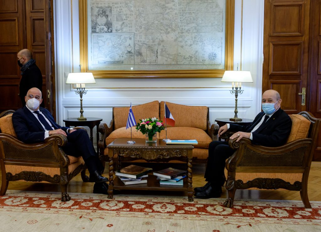 Η συνάντηση άρχισε λίγο μετά τις 11:00 με τη θερμή υποδοχή που επιφύλαξε ο Νίκος Δένδιας στον Ζαν-Ιβ Λε Ντριάν.