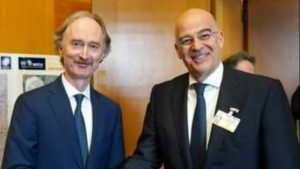 Με τον Ειδικό Απεσταλμένο του Οργανισμού Ηνωμένων Εθνών για τη Συρία @GeirOPedersen στη Γενεύη. Συζητήσαμε για τις πρόσφατες εξελίξεις στη Συρία και για ζητήματα περιφερειακής ασφάλειας. #UN #Syria #Geneva pic.twitter.com/18VjeGw8ZQ