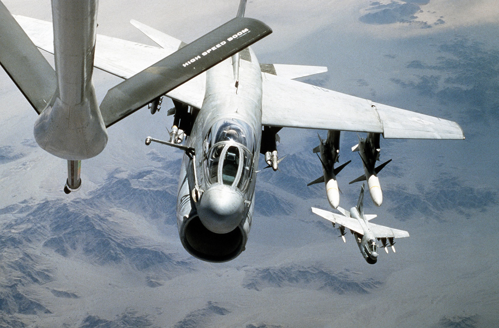 Αφήνοντας το Η-2 να καίγεται για μια ακόμη φορά, τα βομβαρδιστικά μένουν χαμηλά πάνω από την γυμνή έρημο μέχρι να «κροσάρουν» τα σύνορα με την Σαουδική Αραβία και έπειτα παίρνουν ύψος για το ραντεβού με το KC-135 που θα τους ξεδιψάσει με καύσιμο για το ταξίδι της επιστροφής στο «JFK». Το θέμα του καυσίμου σε συνάρτηση με τον κατά γενική ομολογία «υποτονικό» κινητήρα TF41-A-2 του Corsair, οδηγούσε σε πολλές «πατέντες». Από την στιγμή που δεν ήταν σπάνιο για το Α-7Ε να χάνει 20 κόμβους με το που άφηνε τον καταπέλτη με μέγιστο φορτίο, εάν έπρεπε να πετάξει με πλήρες οπλικό φορτίο, π.χ δώδεκα Mk 82 των 500 λιβρών, η απονήωση εκτελείτο με λιγότερο καύσιμο και ακολουθούσε ανεφοδιασμός στον αέρα από αεροσκάφος με σύστημα «Buddy Pack».
