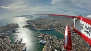 Αυτή τη θρυλική πτώση αναβίωσε ο κ. Ρωσσίδης με το όμορφο υδροπλάνο του, το οποίο «επιλέχθηκε γιατί είναι το μόνο αεροσκάφος που μπορεί να “δείξει” πώς ήταν η πτήση του Farman του Δημήτρη Καμπέρου με χαμηλή ταχύτητα -κάπου 90 χιλιόμετρα την ώρα- καθώς τον πυροβολούσαν Τούρκοι στρατιώτες από το έδαφος και τού τρυπούσαν τα πάνινα φτερά».