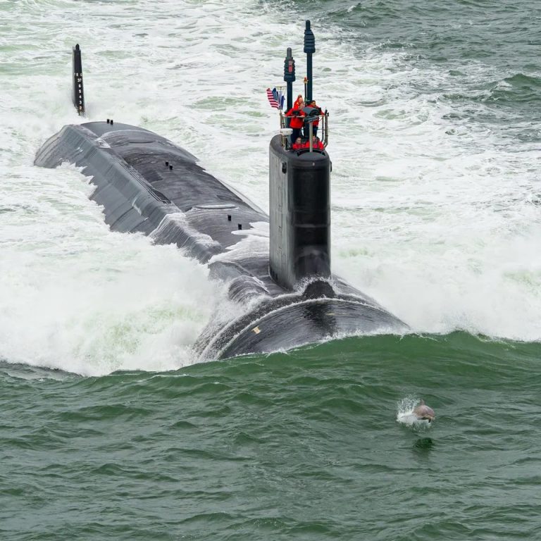 Πανέμορφη φωτό με ένα δελφίνι να παίζει στα κύματα με το πυρηνοκίνητο υποβρύχιο USS John Warner, κλάσης Virginia.
