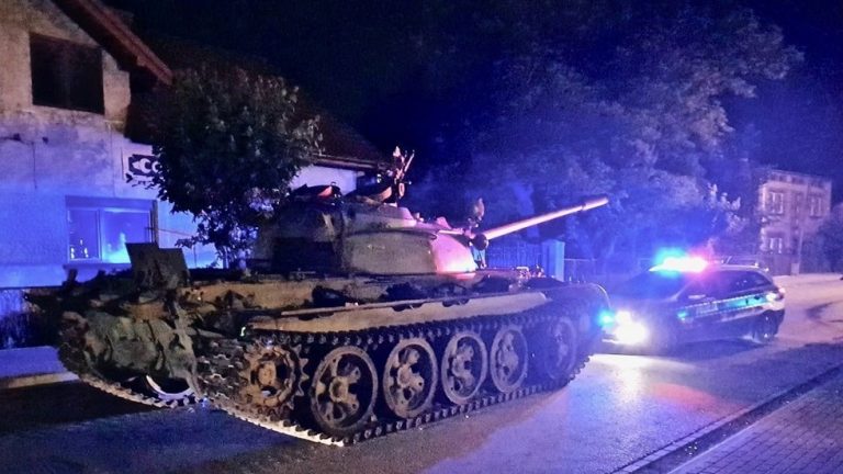Όταν η αστυνομία έφτασε στο σημείο στο χωριό Πατζέτσνο την Πέμπτη το βράδυ, βρήκαν ένα άρμα μάχης από την εποχή της Σοβιετικής Ένωσης παρκαρισμένο μέσα στην μέση κεντρικού δρόμου με τους δυο επιβαίνοντες σε κοντινή απόσταση, ένας από τους οποίους ήταν ένας μεθυσμένος 49χρονος άνδρας που το οδηγούσε.