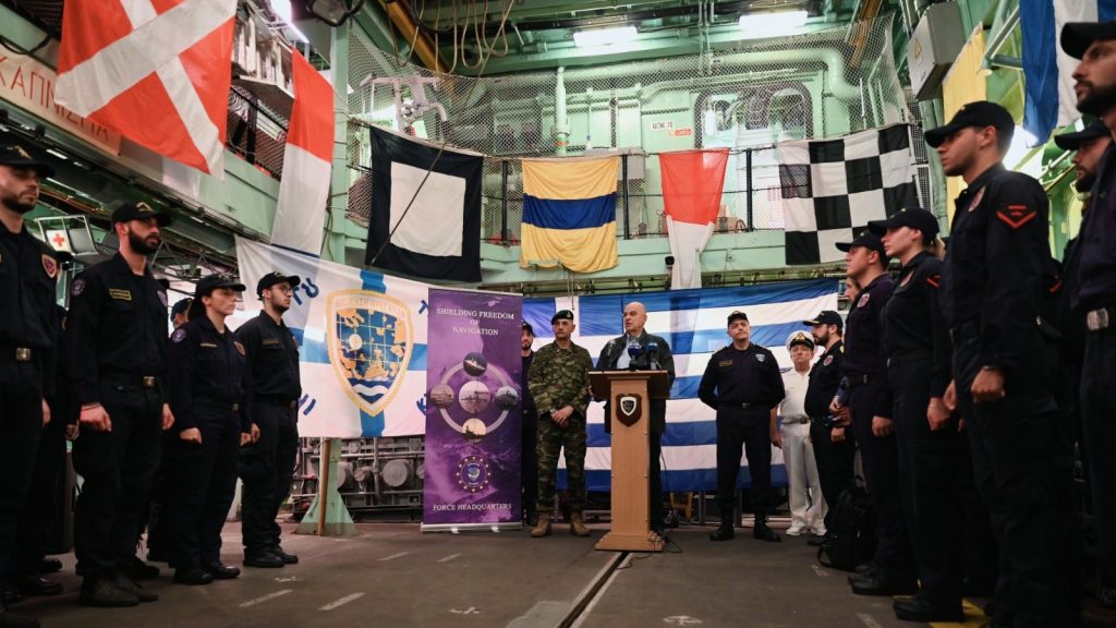 «Η σημερινή ημέρα έχει μεγάλη σημασία για εμάς στην Ελλάδα, γιατί σήμερα αναλαμβάνει την εν πλω διοίκηση της επιχείρησης “Ασπίδες” το δικό μας το Ελληνικό Πολεμικό Ναυτικό με τον αρχιπλοίαρχο, τον κύριο Κωνσταντίνο Πιτυκάκη» υπογράμμισε ο κ. Δένδιας απευθυνόμενος στο πλήρωμα της φρεγάτας.