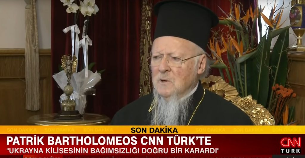 Μεγάλο ενδιαφέρον έχει η συνέντευξη που έδωσε προχθές στο CNN Turk ο Οικουμενικός Πατριάρχης κ. Βαρθολομαίος, στο δημοσιογράφο Serdar Korucu, σχετικά με τον πόλεμο στην Ουκρανία. Ο Παναγιώτατος αναφέρθηκε αρχικά στην γνωριμία του με τον Ουκρανό Πρόεδρο Ζελένσκι, ο οποίος έχει επισκεφθεί 2 φορές το Πατριαρχείο, ενώ υποδέχθηκε τον Πατριάρχη κατά τον εορτασμό των 30 ετών της ουκρανικής ανεξαρτησίας (τότε είχε κάνει αίσθηση το ότι ο Οικουμενικός Πατριάρχης είχε παρακολουθήσει και τη μεγάλη παρέλαση στο Κίεβο).
