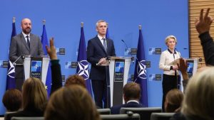Η ΕΕ και το ΝΑΤΟ δεσμεύτηκαν σήμερα να παράσχουν στην Ουκρανία όλα τα στρατιωτικά μέσα που είναι απαραίτητα για να υπερασπιστεί το δικαίωμά της στην αυτοάμυνα, τόνισαν ο Γ.Γ. του ΝΑΤΟ, Γενς Στόλτενμπεργκ, η Πρόεδρος της Επιτροπής, Ούρσουλα φον ντερ Λάιεν και ο Πρόεδρος του Ευρωπαϊκού Συμβουλίου, Σαρλ Μισέλ, κατά τη διάρκεια κοινής συνέντευξης Τύπου.