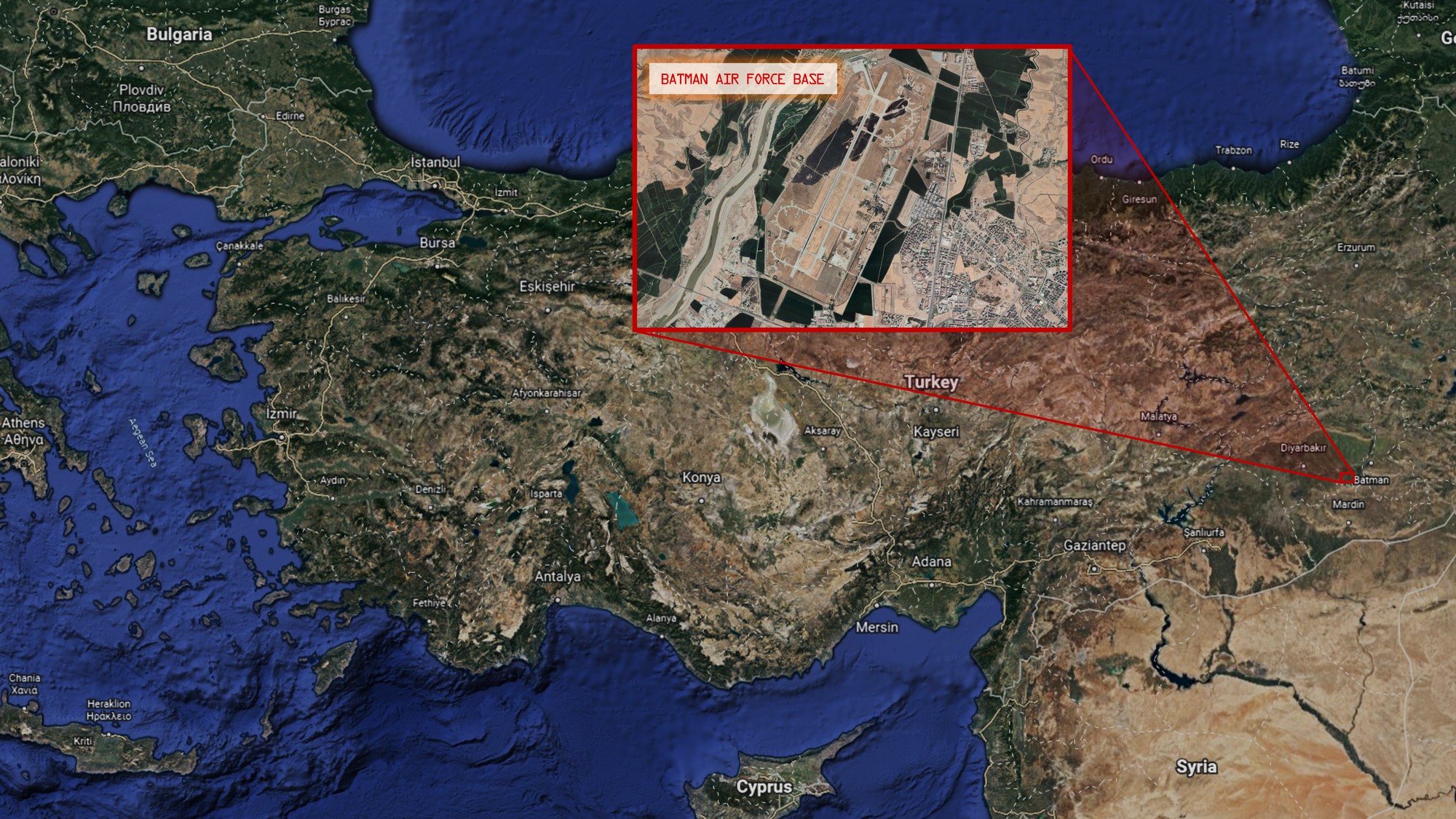 Τα τουρκικά ΜΕΑ δεν απογειώθηκαν από αυτή τη βάση. Εδώ όμως βρίσκονται οι περισσότεροι σταθμοί ελέγχου τους. Μάλιστα, έχουν μετεγκατασταθεί εδώ πρόσφατα επιπλέον σταθμοί από άλλες μονάδες, αφού, 450 χλμ. ανατολικά της Μεσογείου η βάση Batman θεωρείται απρόσβλητη. Οι ένοπλες δυνάμεις βρίσκονται σε ανώτατη επιφυλακή σε όλη τη χώρα, οι άδειες έχουν ανακληθεί, οι σκοπιές και όλες οι υπηρεσίες είναι επανδρωμένες. Σε αυτή τη βάση όμως, το προσωπικό, οι αερονόμοι, οι πυροβολητές, δεν αισθάνονται ιδιαίτερη ανησυχία. Ο πόλεμος είναι κάτι μακρινό. Οι εκατοντάδες Τούρκοι χειριστές ξενυχτούν στις αναπαυτικές πολυθρόνες των σταθμών ελέγχου με κλιματισμό, καφέ ή/και τσιγάρα, ενώ βομβαρδίζουν ένα ελληνικό νησί 1.300 χλμ. μακριά μέσω δορυφορικής ζεύξης.