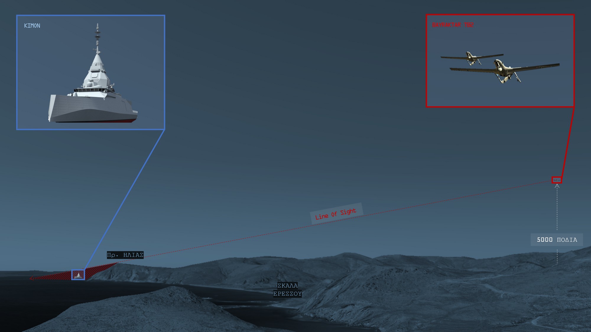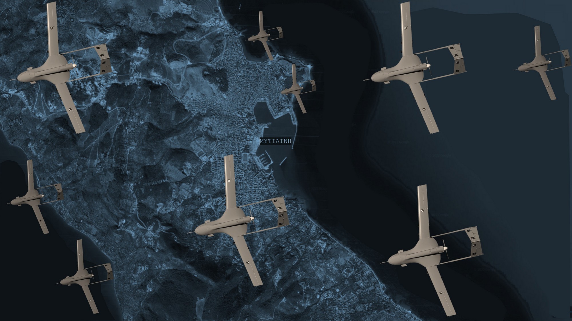 Εκατοντάδες σκοτεινές σιλουέτες τουρκικών ΜΕΑ περνούν αυτή τη στιγμή πάνω από την πόλη. Κινούνται δυτικά προς Ερεσό και μειώνουν σταδιακά ύψος, ώστε οι αισθητήρες τους να εντοπίσουν τυχόν ευκαιριακούς στόχους πάνω στο νησί.