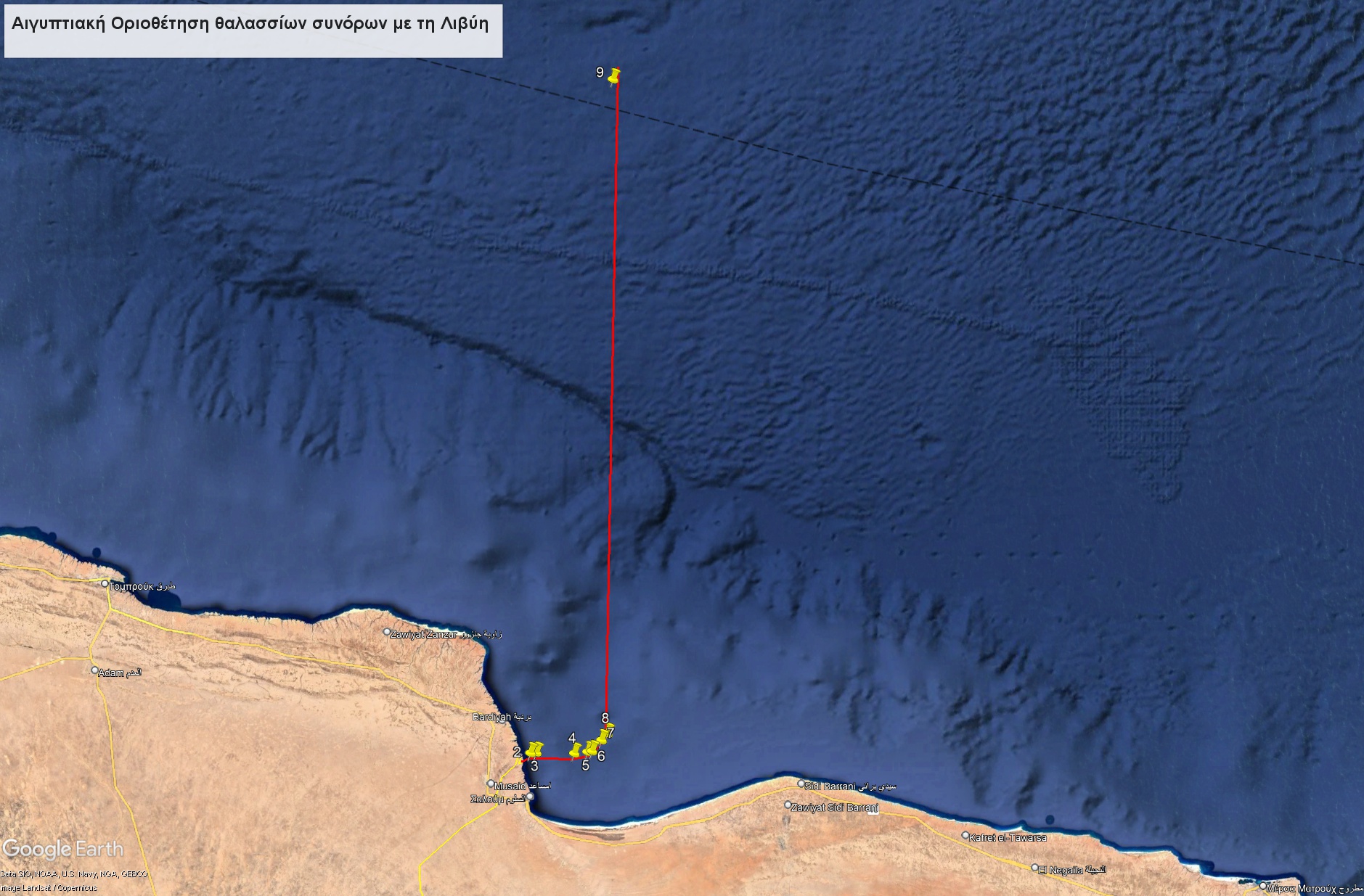 Χθες με το προεδρικό διάταγμα 595/2022 ο Πρόεδρος της Αιγύπτου Αμπντέλ Φατάχ Ελ Σίσι κήρυξε την θαλάσσια οριοθέτηση στα δυτικά της χώρας του, δηλαδή με τη Λιβύη. Συγκεκριμένα ορίζονται δύο στοιχεία. Αρχικά τα 12 μίλια χωρικά ύδατα της Αιγύπτου (πάντα σε σχέση με την Λιβύη) με σημείο εκκίνησης το παράλιο σύνορο Αιγύπτου-Λιβύης. Για τον ορισμό αυτό ανακοινώθηκαν 7 συντεταγμένες (σημεία 2 έως 8) στο σχετικό διάταγμα. Στη συνέχεια, από το σημείο 8, με ευθεία γραμμή προς το Βορρά, έως το σημείο 9, ορίζεται η Αποκλειστική Οικονομική Ζώνη (ΑΟΖ) της Αιγύπτου.