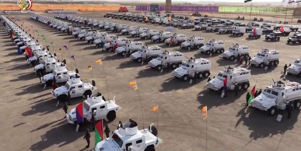 Η αιγυπτιακή συνεισφορά περιλαμβάνει περίπου 1.100 στρατιώτες, εξοπλισμένους με σύγχρονα τεθωρακισμένα οχήματα, όπως τα MRAP BAE Caiman, RG‑33L 6×6 και τα NIMR Ajban 4×4. Παράλληλα, η Αίγυπτος έχει επιβεβαιώσει την ανάπτυξη αεροπορικών μέσων για την υποστήριξη της αποστολής, μεταξύ των οποίων ελαφρά επιθετικά αεροσκάφη τύπου AT‑802U, ελικόπτερα Mi‑24 και Mi‑17, καθώς και πιθανή χρήση UAV για επιχειρήσεις κατά της τρομοκρατίας.
