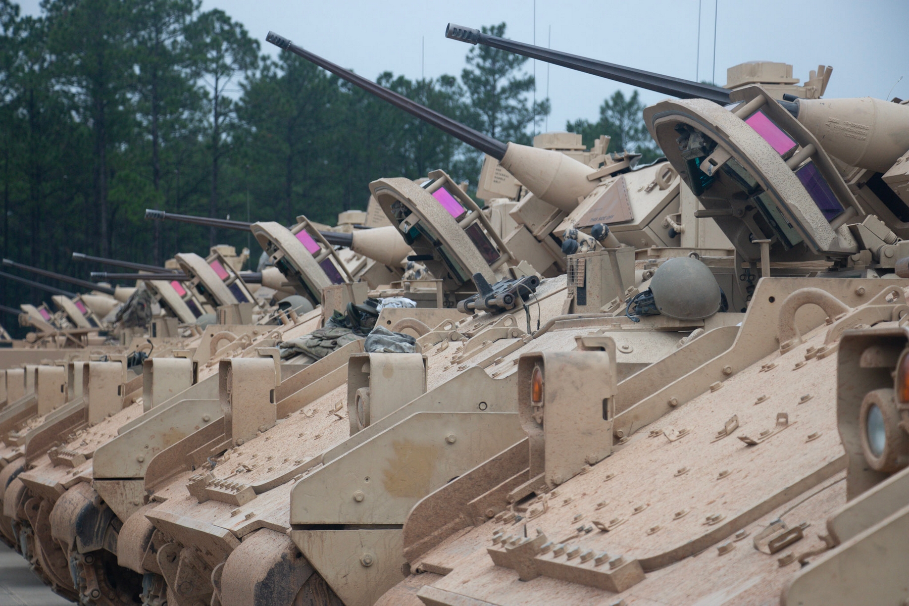 M2A2 Bradley Fighting Vehicles of A co, 3rd Battalion, 15th Infantry Regiment, 2nd Armored Brigade Combat Team, are staged in preparation to begin gunnery tables, August 22, at Fort Stewart, Ga. (U.S. Army photo by Sgt. Brian Johnston/released).