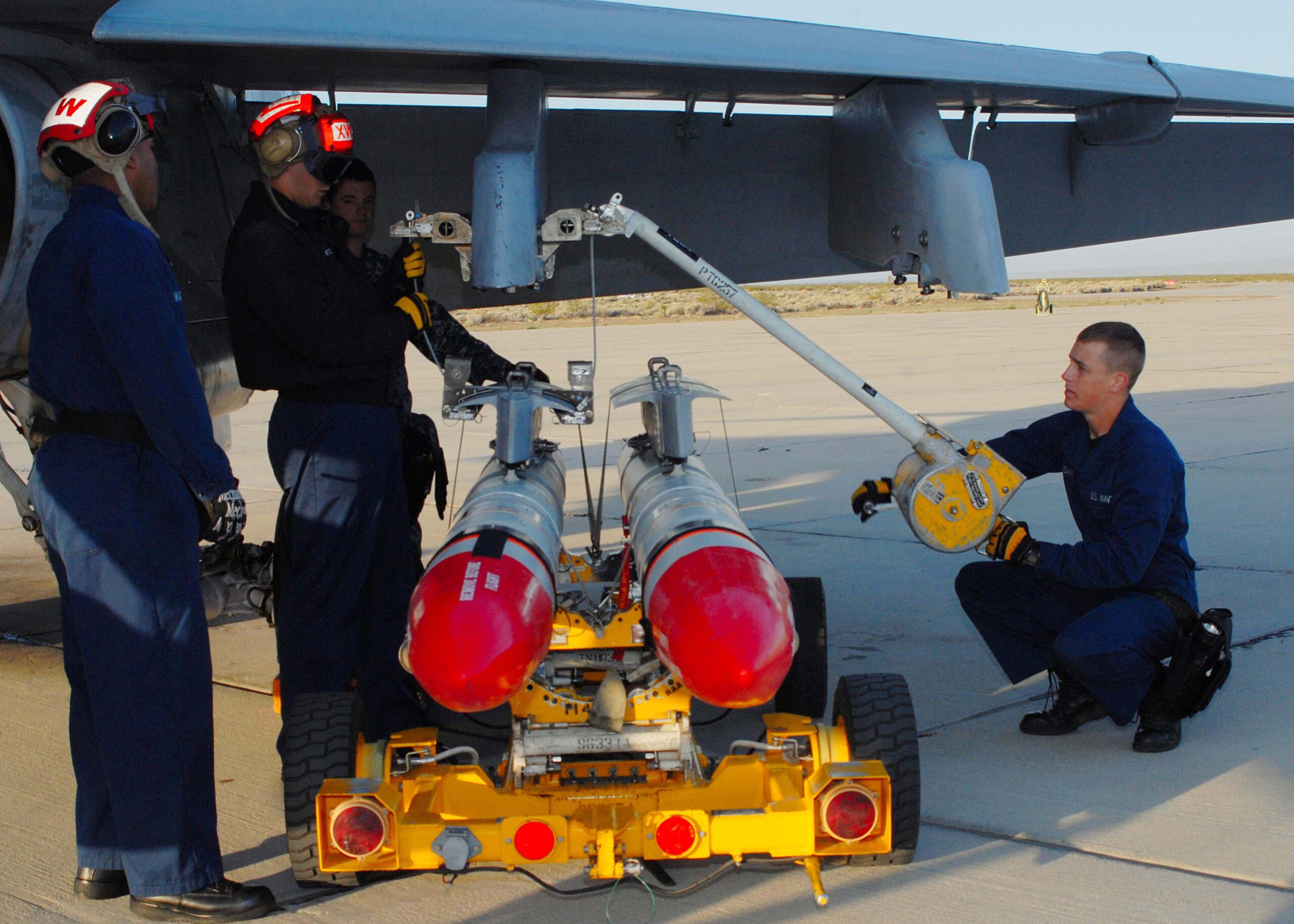 Aviation ordnancemen assigned to the Vampires of Air Test and Evaluation Squadron 9 install AGM-88 Echo advanced anti-radiation guided missiles on an F/A-18D Hornet for test launches at Naval Air Weapons Station China Lake.