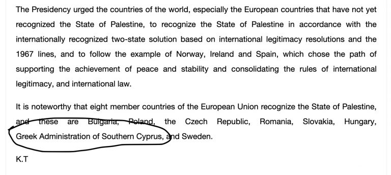 EKTAKTO: Οι Παλαιστίνιοι αναφέρουν την Κύπρο σαν “ελληνική διοίκηση της Νότιας Κύπρου”